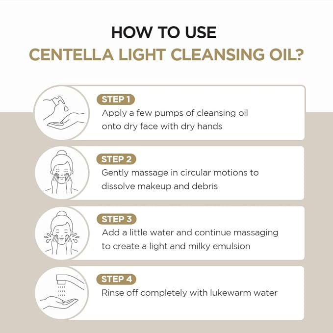 Apply a few pumps of cleansing oil onto dry face with dry hands. Massage gently in circular motions. Emulsify with water to create a milky emotion before rinsing off completely with lukewarm water.